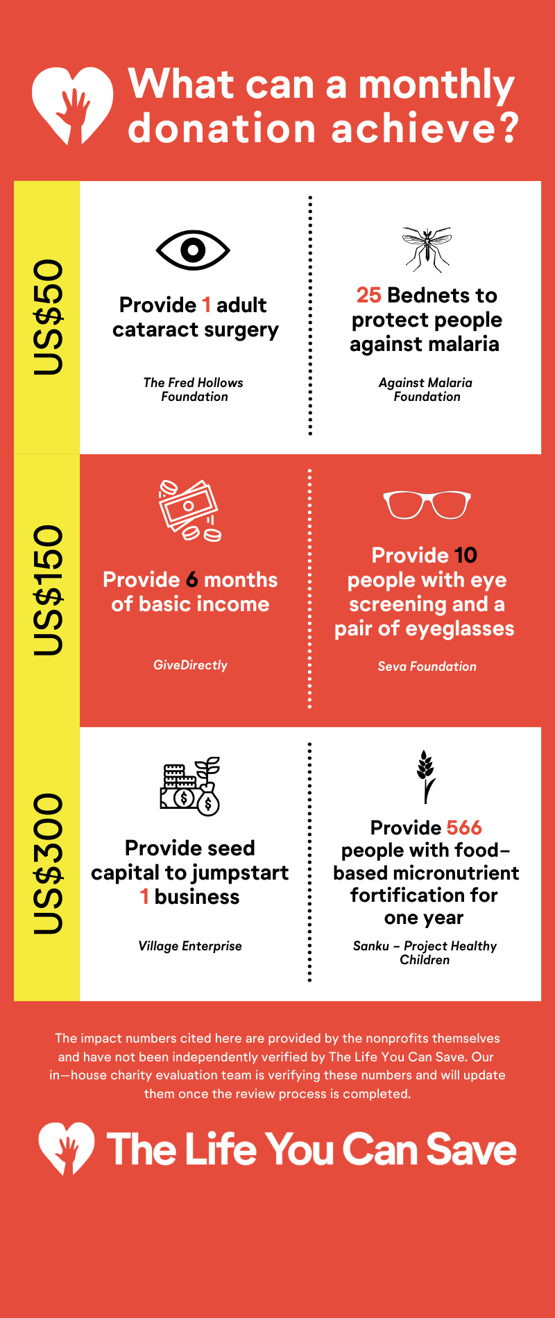 Set up a monthly donation to The Life You Can Save itself or to one or more of our Best Charities and get your first month’s donation matched! For example, if you set up a new $100 monthly donation, we’ll donate an additional $100 donation one time.